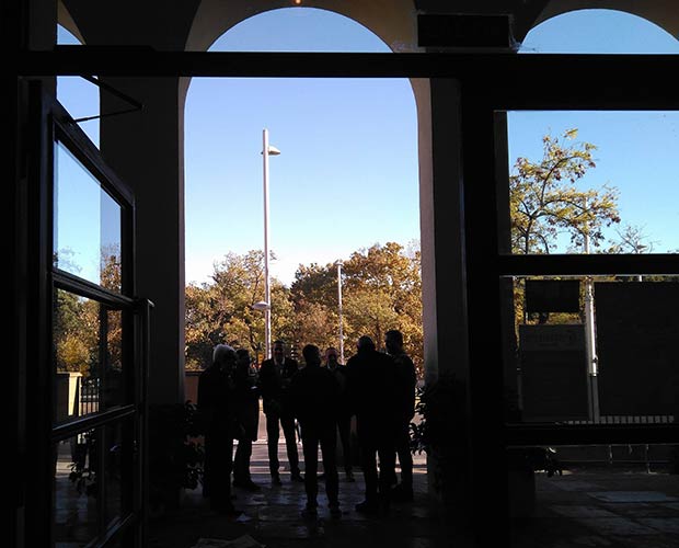 El monumento es ligero en estructura y material, completamente adecuado al sottofondo de cristal y acero del edificio central de Ibercaja.